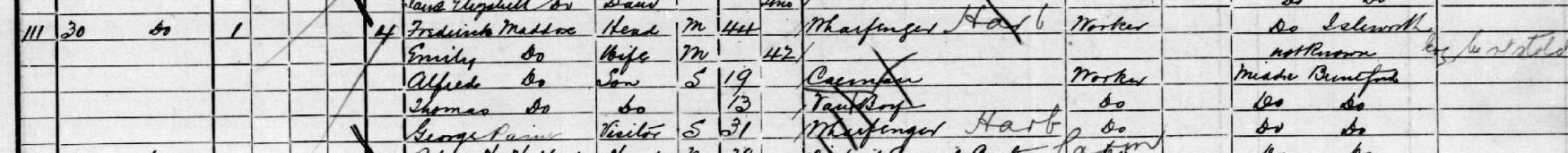 1 | 111 | FREDERICK | MADDOX | Head | 1857 | Islesworth, Middlesex | 44 | Male | Married | | | | Wharfinger (Harbour) | | | | | 2 | 111 | EMILY | Maddox | Wife | 1859 | Entered as Not Known | 42 | Female | Married | | | | | | | | | 3 | 111 | Alfred | Maddox | Son | 1882 | Brentford, Middlesex | 19 | Male | | | | | Carman | | | | | 4 | 111 | THOMAS | MADDOX | Son | 1888 | Brentford, Middlesex | 13 | Male | | | | | Van Boy | | | | | 5 | 111 | George | Paine | Visitor | 1870 | Brentford, Middlesex | 31 | Male | | | | | Wharfinger (Harbour) | | | | |