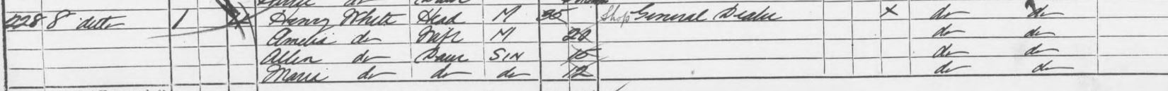 1 | 228 | Henry | White | Head | 1856 | Hammersmith | 35 | | Married | | | | General Dealer (shop) | | | | | 2 | 228 | AMELIA | White (WRIGHT) | Wife | 1871 | Hammersmith | 20 | | Married | | | | | | | | | 3 | 228 | Ellen | White | Daughter | 1876 | Hammersmith | 15 | | Single | | | | | | | | Step - Daughter to Amelia | 4 | 228 | Maria | White | Daugther | 1879 | Hammersmith | 12 | | | | | | | | | | Step - Daughter to Amelia | 5 | 228 | Mary | White | Daughter | 1881 | Hammersmith | 10 | | | | | | | | | | Step - Daughter to Amelia | 6 | 228 | Caroline | White | Daughter | 1883 | Hammermith | 8 | | | | | | | | | | Step - Daughter to Amelia | 7 | 228 | Elizabeth | White | Daughter | 1885 | Hammersmith | 6 | | | | | | | | | | Step - Daughter to Amelia |
