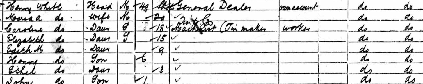 1 | 143 | Henry | White | Head | 1852 | Hammersmith | 49 | Male | Married | | | | General Merchant Dealer | | | | | 2 | 143 | AMELIA M | White (WRIGHT) | Wife | 1872 | Hammersmith | 29 | Female | Married | | | | | | | | | 3 | 143 | Caroline | White | Daughter | 1883 | Hammersmith | 18 | Fermale | Single | | | | Machinist (Tin Maker) | | | | Step - Daughter to Amelia | 4 | 143 | Elizabeth | White | Daugther | 1886 | Hammersmith | 15 | Female | Single | | | | | | | | Step - Daughter to Amelia | 5 | 143 | Edith | White | Daughter | 1892 | Hammersmith | 9 | Female | | | | | | | | | | 6 | 143 | Henry | White | Son | 1895 | Hammermith | 6 | Male | | | | | | | | | | 7 | 143 | Ethel | White | Daughter | 1898 | Hammersmith | 3 | Female | | | | | | | | | | 8 | 143 | John | White | Son | 1900 | Hammersmith | 1 | Male | | | | | | | | | |