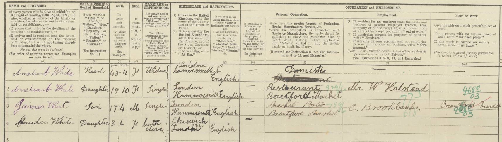 1 | 1 | AMELIA | WHITE (WRIGHT) | Head | 1873 | Hammersmith | 48 | Female | Widowed | | | | Domestic | | | | | 2 | 1 | AMELIA | WHITE | Daughter | 1902 | Hammersmith | 19 | Female | Single | | | | Worked for Mr W Halstead at his Rest | | | | | 3 | 1 | James | White | Son | 1904 | Hammersmith | 17 | Male | Single | | | | Porter at Brentford Market working f | | | | | 4 | 1 | FLORENCE MAUDE | WHITE | Daugther | 1918 | Hammersmith | 3 | Female | Single | | | | | | | | |