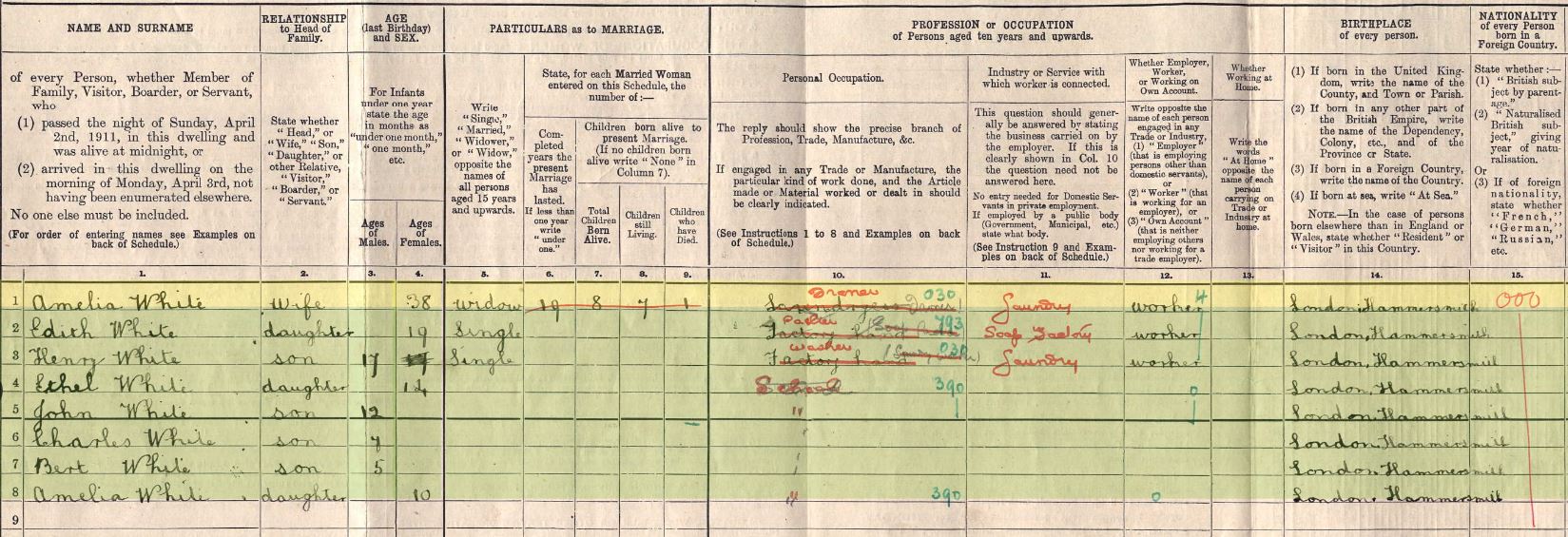 1 | 1 | AMELIA | WHITE | Head | 1873 | Hammersmith | 38 | Female | Widowed | 19 | 8 | 1 | Ironer at a laundry | | | | | 2 | 1 | Edith | White | Daughter | 1892 | Hammersmith | 19 | Female | Single | | | | Packer in a soap factory | | | | | 3 | 1 | Henry | White | Son | 1894 | Hammersmith | 17 | Male | Single | | | | Washer in a laundry | | | | | 4 | 1 | Ethel | White | Daughter | 1897 | Hammersmith | 14 | Female | | | | | | | | | | 5 | 1 | John | White | Son | 1899 | Hammersmith | 12 | Male | | | | | | | | | | 6 | 1 | Charles | White | Son | 1904 | Hammermith | 7 | Male | | | | | | | | | | 7 | 1 | Bert | White | Son | 1906 | Hammersmith | 5 | Male | | | | | | | | | | 8 | 1 | Amelia | White | Daughter | 1901 | Hammersmith | 10 | Female | | | | | | | | | |