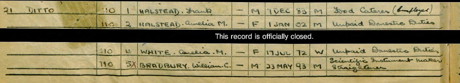 43 | 110 | Frank | Halstead | Head | 7 Dec 1883 | | | Male | Married | | | | Owner of a Restuarant | | | | Restuarant was in Brentford Market | 44 | 110 | Amelia M | Halstead (White) | Wife | 2 Jan 1902 | | | Female | Married | | | | Unpaid Domestic Duties | | | | | 45 | 110 | AMELIA M | White (WRIGHT) | | 17 Jul 1872 | | | Female | Widowed | | | | Unpaid Domestic Duties | | | | | 46 | 110 | William C | Bradbury | | 23 May 1893 | | | Male | Married | | | | Scientific Insrament Maker (Straight | | | | |