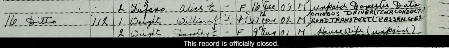 1 | 1 | William J | Wright | Head | 17 Mar 1902 | | | Male | Married | | | | Omnibus driver and Conductor | | | | | 2 | 1 | DorothyE | Wright | Wife | 9 Aug 1901 | | | Female | Married | | | | | | | | |