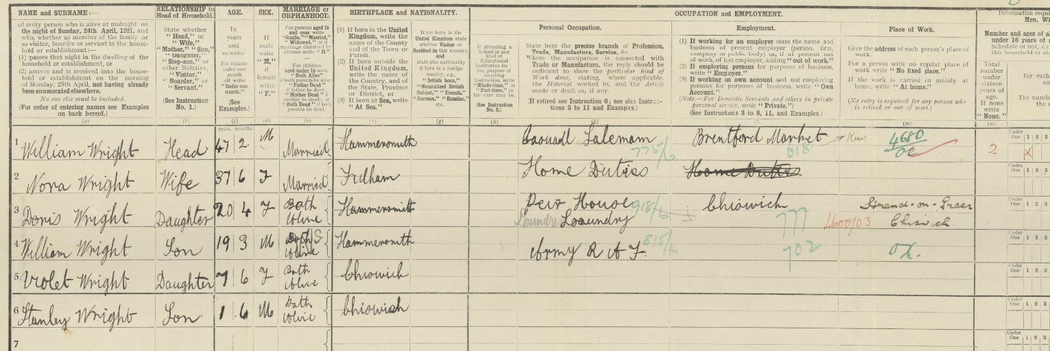 1 | 1 | William | Wright | Head | 1874 | Hammersmith | 47 | Male | Married | | | | Casual Salesman at Brentford Market | | | | | 2 | 1 | Nora | Wright | Wife | 1884 | Fulham | 37 | Female | Married | | | | Home Duties | | | | | 3 | 1 | Doris | Wright | Daughter | 1901 | Hammersmith | 20 | Female | Single | | | | Pier House Laundry in Chiswick | | | | Step-Daughter to Nora | 4 | 1 | William | Wright | Son | 1902 | Hammersmith | 19 | Male | Single | | | | Army R.A.F | | | | Step-Son to Nora | 5 | 1 | Violet | Wright | Daughter | 1914 | Chiswick | 7 | Female | | | | | | | | | | 6 | 1 | Stanley | Wright | Son | 1920 | Chiswick | 1 | Male | | | | | | | | | |