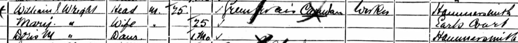 1 | 223 | William J | Wright | Head | 1876 | Hammersmith | 25 | Male | Married | | | | Greengrocers Carman | | | | | 2 | 223 | Mary | Wright | Wife | 1876 | Earls Court | 25 | Female | Married | | | | | | | | | 3 | 223 | Doris M | Wright | Daughter | 1900 | Hammersmith | 1m | Fermale | | | | | | | | | |